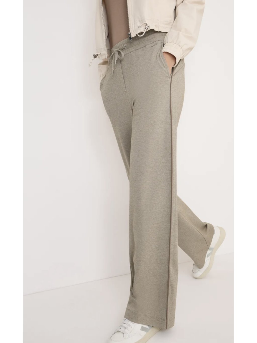 Dámské kalhoty Neele od CECIL se pyšní melírovaným vzhledem, lemovacími proužky a módním volným střihem. Vysoký pas, široké nohavice a elastický pas se stahovací šňůrkou zajišťují ležérní nošení.